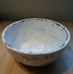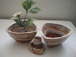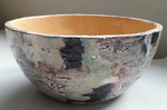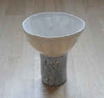 Met de hand opgebouwde schalen, vazen en kommen van steengoed en porselein. soms een combinatie van steengoed en porselein. Geglazuurd.