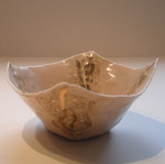 2013schaaltje van porselein, verschillende glazuren over elkaar heen gezet in crème en wit met goudluster