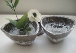 2015twee kommen met los binnenstuk, waardoor ze als vazen gebruikt kunnen worden. hooggebakken zwarte klei met verschillende donkere en witte glazuren