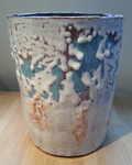 2016vaas van steengoed, beige/bruin, met rand van blauw gekleurd porselein met wit bobbelig glazuur