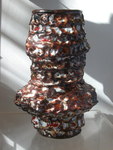2017Hoge licht gekleurde vaas, rode klei en hoog gestookt (1200 gr). diverse glazuren en kleuren over elkaar heen gezet. Afgewerkt met goudglazuur